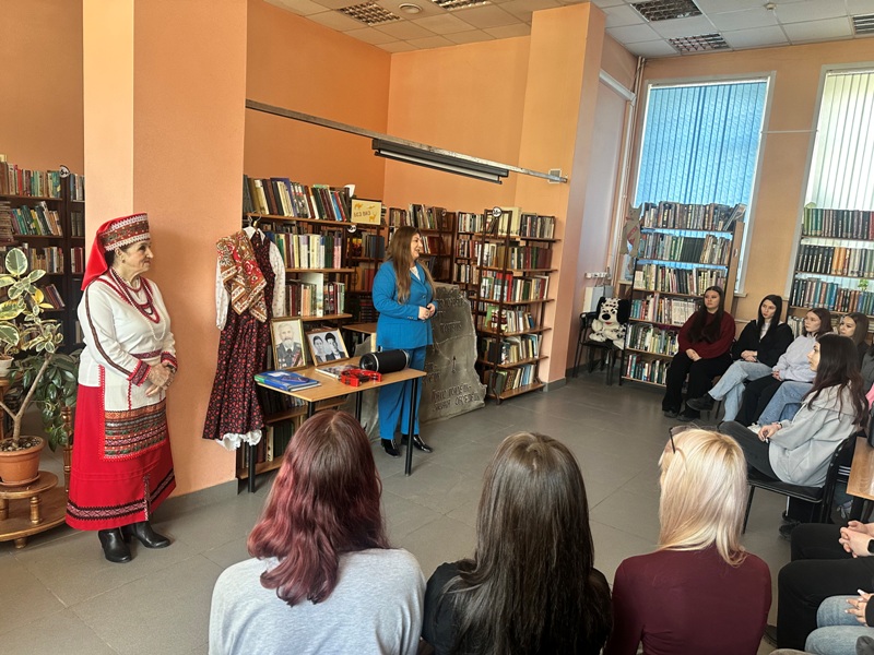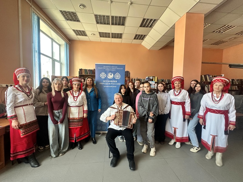 Организатор встречи – Ассамблея народов России Алтайского края. С приветственным словом выступила председатель Ассамблеи народов России Алтайского края Буянкина Елена. Она ещё раз напомнила молодёжной аудитории о том, что 2026 год – год единения народов России, о том, что Россия - многонациональная страна, где всегда с уважением относились к истории, культуре, духовным ценностям народностей. Татьяна Булгакова, художественный руководитель ансамбля «Аше Келей», рассказала, каким образом её семья оказалась на Алтае. В одном из поселков края была целая улица, на которой жили мордвины, и, несмотря на русское окружение, не потеряли национальной самобытности и передали её своим детям. Татьяна Петровна рассказала о своих родителях, показала семейный фотоальбом. Присутствующие с интересом рассматривали старинный национальный мордовский костюм, которому более 200 лет. А затем в стенах библиотеки зазвучали веселые и лирические песни на русском и мордовском языках в сопровождении баяна. Молодежь очень тепло приняла выступление артистов, благодарила их аплодисментами. В завершении встречи ребята с внимание листали семейный альбом и задавали вопросы артистам.