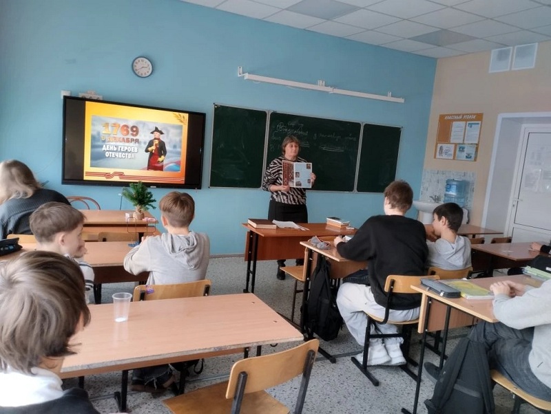 Школьники узнали, что День Героев Отечества тесно связан с нашей историей. Он знаменует подвиги всех, кто своими делами, поступками, всей своей жизнью показывает пример служения своей Родине. Увлеченно слушали ребята рассказ о первых георгиевских кавалерах, о героях Алтайской земли – П. Плотникове, В. Кащеевой, В. Христенко. В ходе беседы подростки рассуждали о том, кого можно назвать героем и поговорили о Героях современной России.