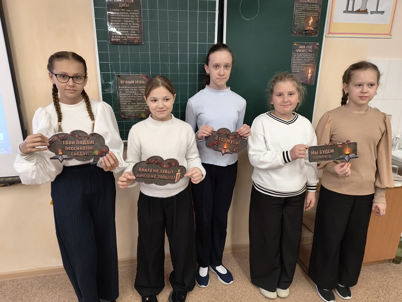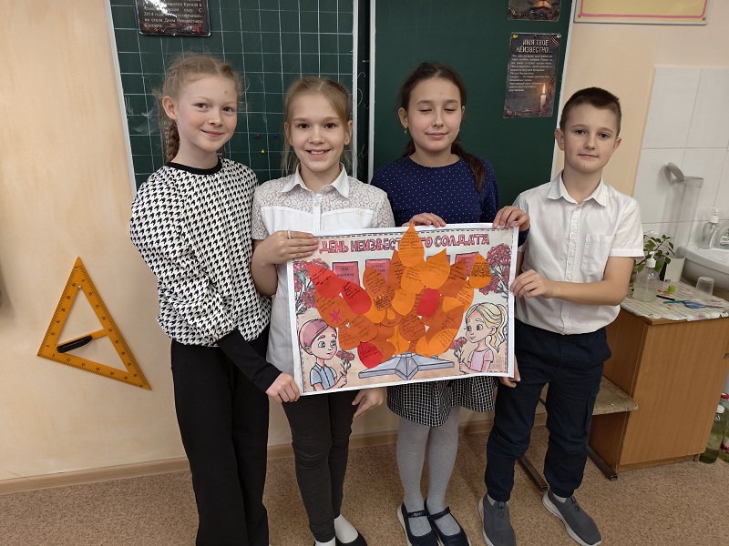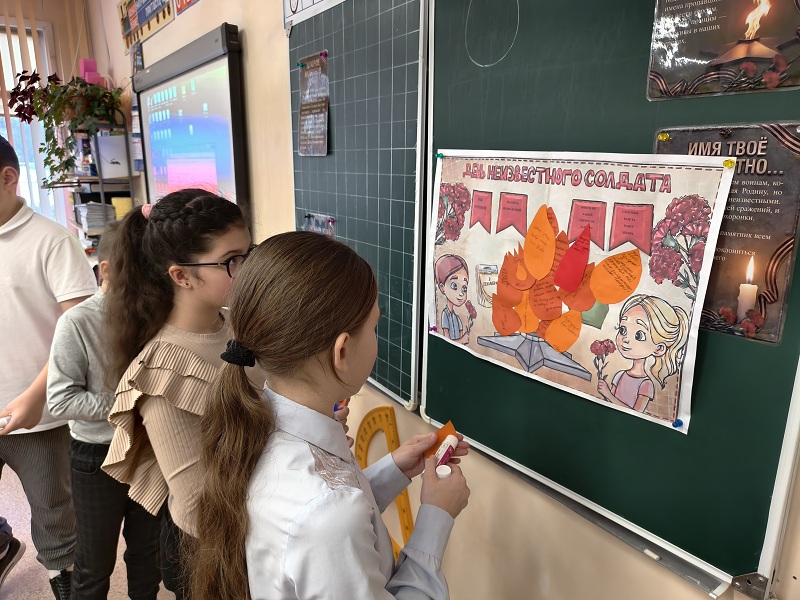 Главной темой встречи стала история возникновения Дня Неизвестного Солдата. Учащиеся узнали, почему на могиле лежат именно каска и знамя, и как поэт Сергей Михалков нашёл те самые слова, которые теперь высечены в граните. Особое внимание было уделено символу Вечного огня. Школьники узнали о его уникальной инженерии, не позволяющей пламени погаснуть в любую погоду, и об исторической эстафете передачи огня из Ленинграда в Москву. Важной частью патриотического часа стал разговор о работе современных героев-поисковиков Алтайского края, которые ежегодно возвращают имена пропавшим без вести героям. В завершение встречи ребята закрепили полученные знания в ходе викторины, отвечая на вопросы о городах-героях и традициях памяти, а также совместными усилиями создали плакат «Негасимое пламя». Этот час стал напоминанием о том, что Вечный огонь горит не для мёртвых, а для живых — чтобы мы помнили цену мира.