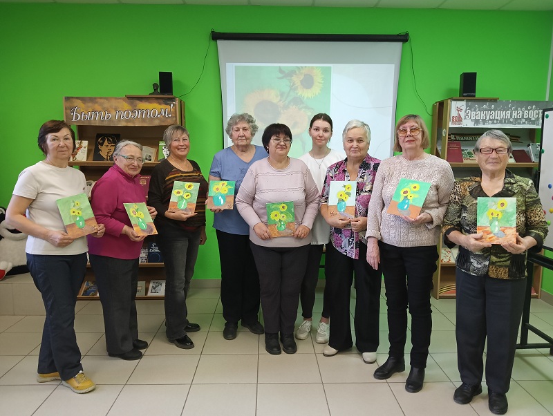 Темой сегодняшней встречи стал «натюрморт», да не простой, а «Подсолнухи» Винсента Ван Гога. Но даже такая непростая работа не испугала наших гостей, которые с рвением, аккуратностью, упорством, а самое главное с хорошим настроением принялись рисовать натюрморт. Картины получились великолепные, каждая со своей изюминкой и акцентом. Но, главное, что участницы встречи остались очень довольны проведенным временем и своим творчеством!