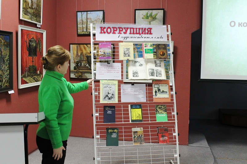 В завершение встречи присутствующие смогли понять, какой вред наносит коррупция развитию экономики и страны в целом, какие меры уголовного наказания принимаются правительством по борьбе с ней. Дополнением к мероприятию была подготовлена книжная выставка «Коррупция в художественном слове».