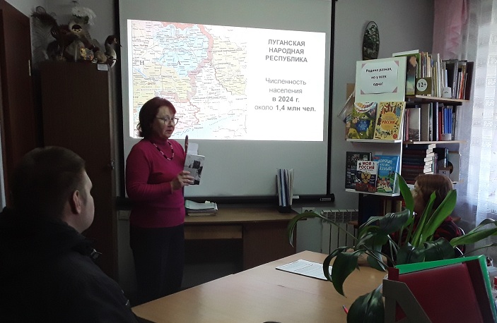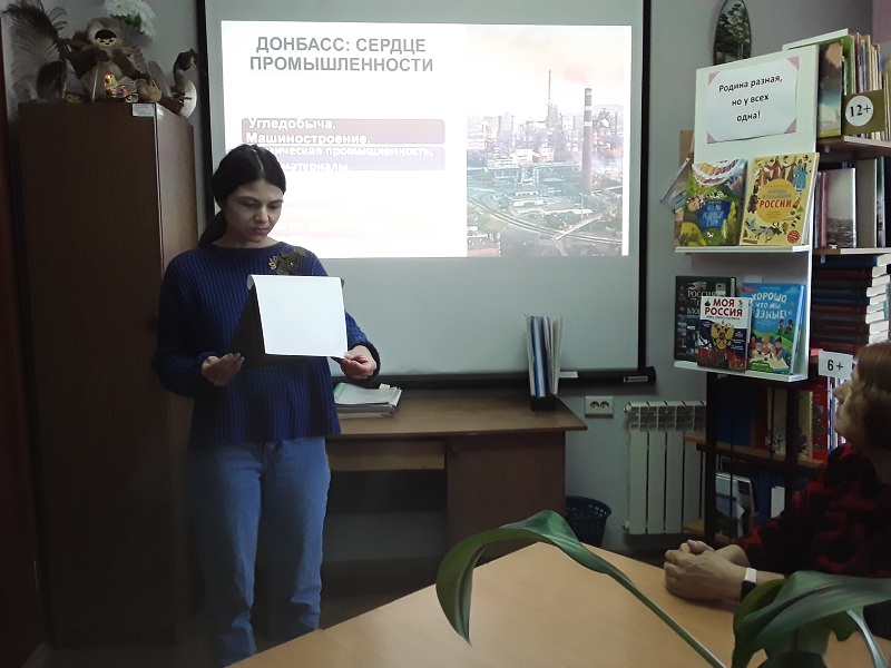Выставка называлась «Родина разная, но у всех одна!». Перед началом мероприятия прошла беседа о событиях на Донбассе, затем обзор книг с выставки. На ней была представлена новая книга Анны Ревякиной «Восемь. Донбасских. Лет». После просмотра седьмой серии фильма «Дети Донбасса» состоялось обсуждение.