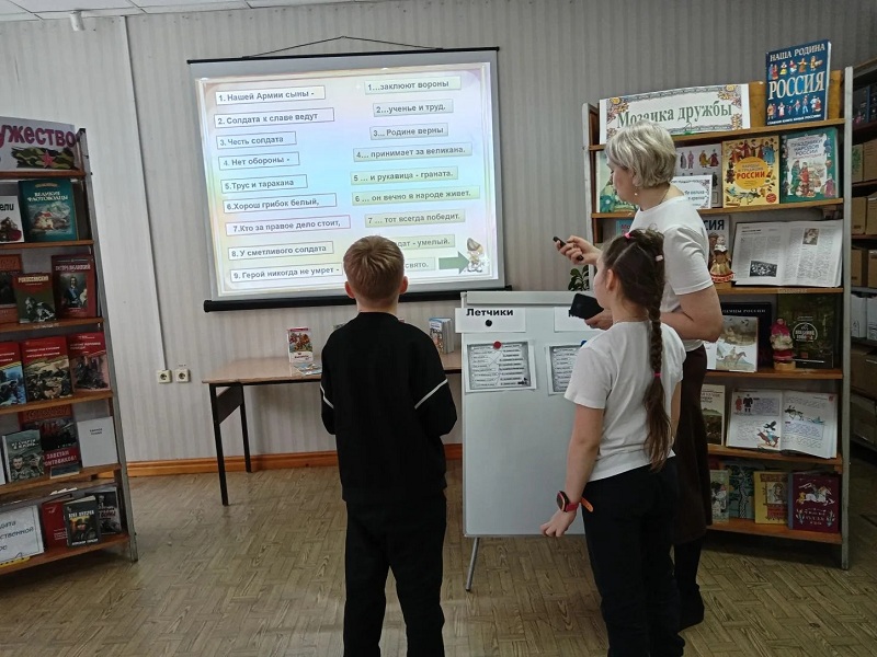 В начале мероприятия сотрудник библиотеки рассказала детям об истории и значении праздника. Для проверки силы, смекалки и ловкости школьники приняли участие в игре «Служу отечеству». Разделившись на две команды, «Моряки» и «Летчики», ребята отвечали на вопросы по истории русской армии, расшифровывали анаграммы. С азартом дети разгадывали филворды на военную тематику, составляли по смыслу пословицы о воинской службе, рассуждали о том, какими качествами должны обладать защитники Отечества. В завершение игры сотрудник библиотеки познакомила детей с книжной выставкой «Отвага, мужество и честь», на которой были представлены произведения о великих русских полководцах и адмиралах и важных сражениях. Мероприятие завершилось просмотром видеофильма о празднике мужества, силы духа, доблести и чести.