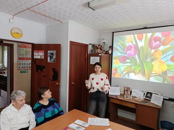 Для взрослых пользователей библиотеки была подготовлена слайдовая презентация «Год театра». Участники литературной гостиной вспомнили самые известные театры в Алтайском крае, историю их основания, знаменитых актеров. Акцентировалось внимание на такую семейную ценность, как преемственность поколений в театральной династии семьи Кирковых, известных актеров Алтайского краевого театра драмы им. В. М. Шукшина. Беседу украсили музыкальные номера, викторины, фрагменты из художественных фильмов, воспевающих образ русской женщины. В конце мероприятия читателям вручили раздаточный материал – буклет со стихами известной алтайской поэтессы Л. А. Власовой «Опять весенние рулады». Мероприятие прошло в рамках клуба любителей чтения «Книгочей».