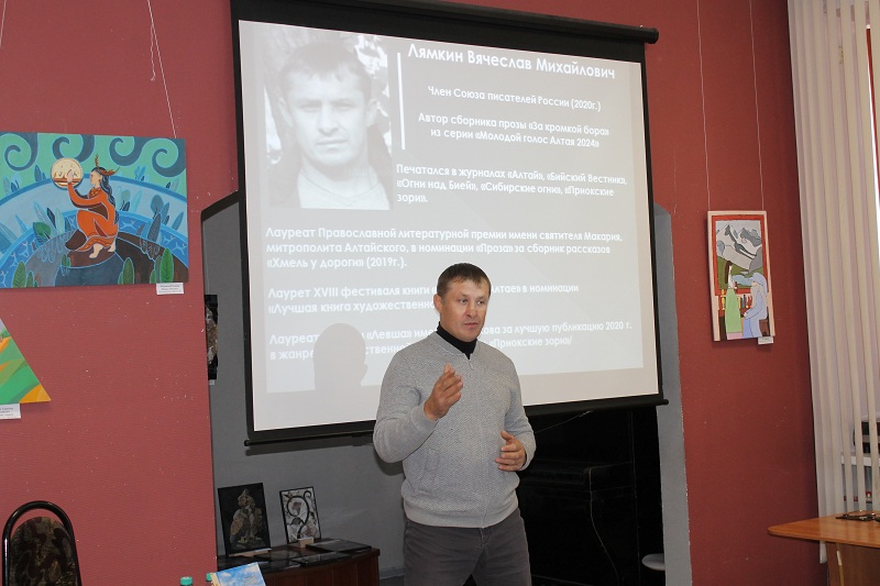 Вячеслав Михайлович приехал к нам из Бийска, но с Барнаулом у него давние связи – годы учёбы в педагогическом университете в прошлом, друзья и коллеги по писательскому делу в настоящем. Родился же и вырос писатель в милом его сердцу Павловске. Именно с рассказа о малой родине, с признания в любви к дорогим местам и началось общение писателя со слушателями (в основном это была студенческая молодёжь института культуры). Проникновенное повествование моментально нашло отклик у нашей аудитории: посыпались вопросы о детстве, семье, творчестве, сюжетах и героях созданных произведений, планах на будущее и т.д. Завязался хороший, умный диалог, где нашлось место интересным ответам на вопросы слушателей, чтению прозы и поэзии. Подготовленные библиотекарем презентация и книжная выставка позволили аудитории максимально полно познакомиться с биографией и библиографией писателя Вячеслава Михайловича Лямкина. Вячеслав Михайлович подарил библиотеке свою книгу с дарственной надписью (повесть «Конь с горы Бабырган»), а заинтересованные читатели отправились на кафедру оформлять книги писателя для чтения дома.