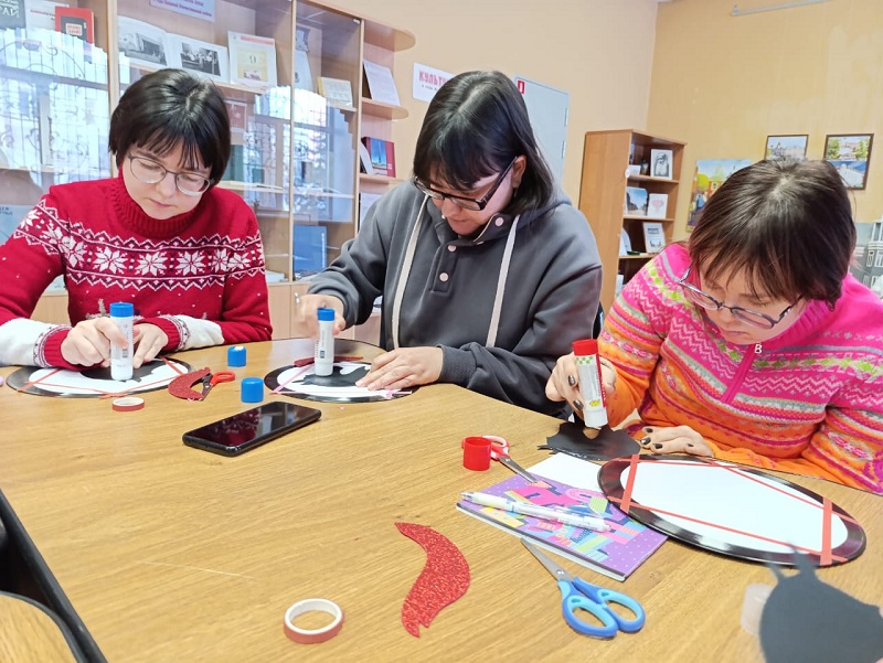 Затем для молодых людей пластинка послужила своеобразным холстом для творчества, ведь есть пластинки, которые состарились, поцарапаны и уже не играют. Итогом мастер-класса стала аппликация на виниловой пластинке, сюжетом которой стал символ Нового наступающего 2026 года.