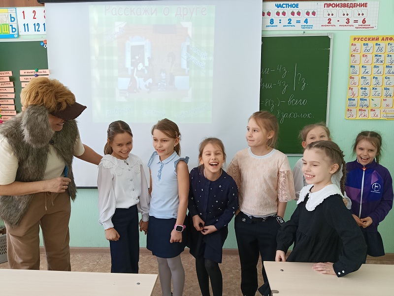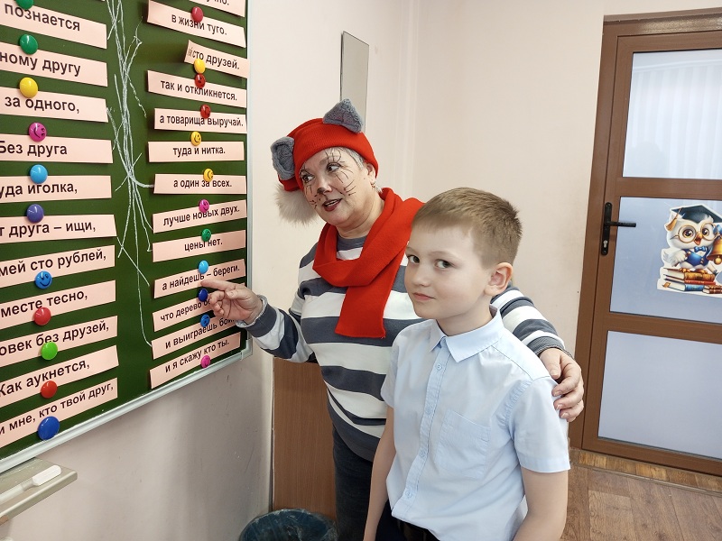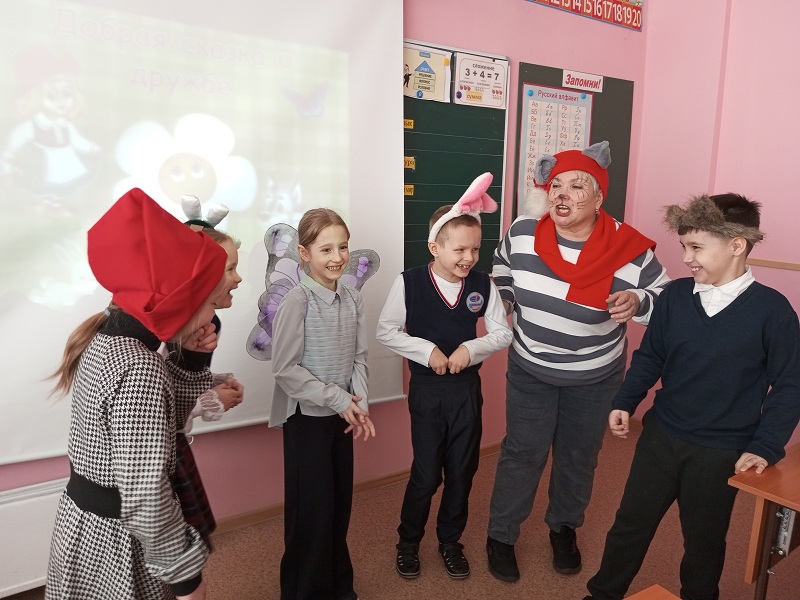 Встреча была посвящена одной из самых важных ценностей в жизни каждого человека – дружбе. И кто же мог лучше всего рассказать о дружбе, чем любимые герои из Простоквашино? Кот Матроскин и пёс Шарик, чьи вечные споры и недопонимания знакомы многим, решили наконец-то разобраться в своих отношениях! Вместе с юными читателями они отправились в увлекательное путешествие по страницам книг о дружбе. Ведь именно эти истории лучше всего показывают, как строить крепкие и доверительные отношения, как важно понимать и поддерживать друг друга. Первоклассники с радостью делились своими секретами дружбы: рассказывали о своих лучших друзьях, о любимых совместных играх и увлечениях. Матроскин и Шарик были просто поражены эрудицией юных читателей! Ребята продемонстрировали удивительные знания о литературных героях, пословицах и поговорках, посвящённых дружбе. Завершилась встреча доброй и весёлой сказкой, которую ребята разыграли сами. Она наглядно показала, как легко и просто можно найти новых друзей, если проявить чуточку понимания и открытости, конечно же, поделиться улыбкой!