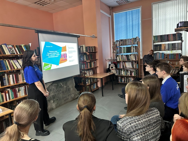 Представители Всероссийской молодёжной общественной организации «Молодая Гвардия Единой России» – Маковецкая Софья, Белоносова Людмила и Богданов Вячеслав – рассказали о том, что организация объединяет активных, инициативных молодых людей, даёт возможность проявить себя и быть услышанным, а также помогает разобраться в праве, политике и общественной жизни. Молодогвардейцы предложили старшеклассникам разделиться на две команды и с помощью игровых моментов ответить на вопросы квиза по избирательному праву. По правилам игры учащимся запрещалось пользоваться телефонами и подсказывать другой команде. Ребятам потребовалось сосредоточиться, отвечать кратко и точно. На большинство вопросов были даны правильные ответы, некоторые вопросы заставили поломать голову и порассуждать. По итогам квиза капитанам команд были вручены грамоты.