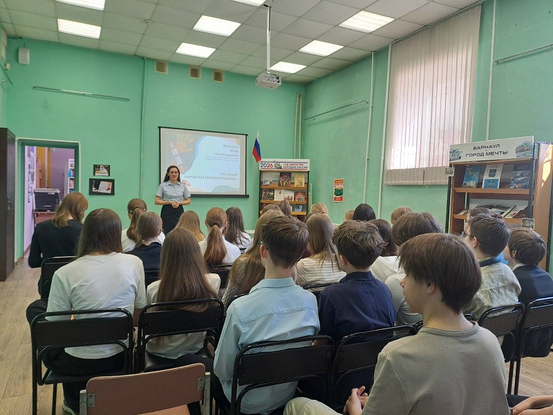 Гостем встречи стала Шевченко Юлия Александровна — начальник отделения межведомственного взаимодействия в сфере профилактики УНК МВД России по Алтайскому краю. Юлия Александровна рассказала ребятам об уголовной и административной ответственности за незаконное приобретение, хранение, перевозку, изготовление, переработку и распространение наркотических средств и психотропных веществ, а также о правовых последствиях вовлечения несовершеннолетних в незаконный оборот наркотиков. Кроме того, она напомнила о том, как противостоять давлению со стороны людей, предлагающих попробовать запрещённые вещества.