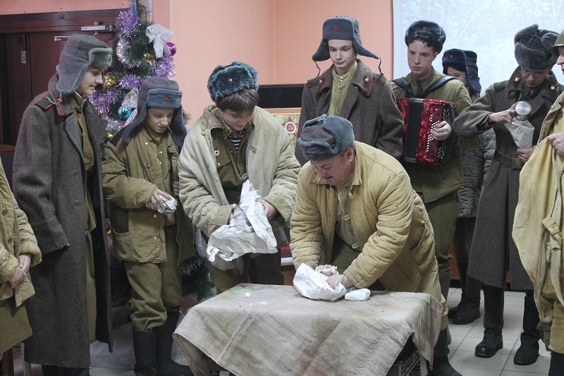 Атмосфера военных лет была воссоздана не только в костюмах героев-воинов, но и в особом лирическом настроении - это рассказ у новогоднего стола о своей малой Родине, о том, какие профессии выберут молодые люди после долгожданной Победы.